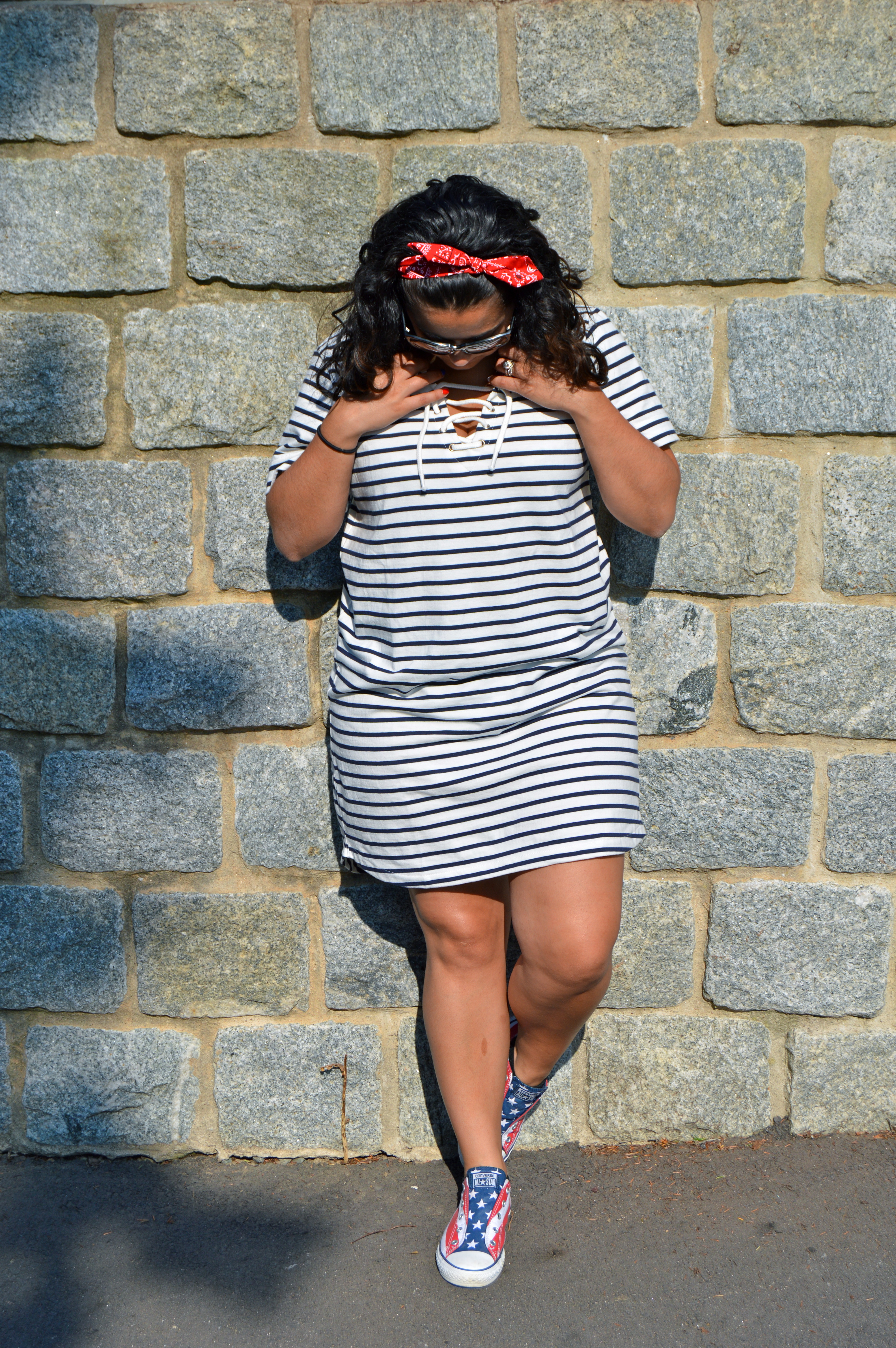 Dress: H&M $24.99; Sneakers: Converse Outlet $24; Headband: Icing $12; Anchor Earrings: Lauren Conrad Collection $8.40 (Kohls)