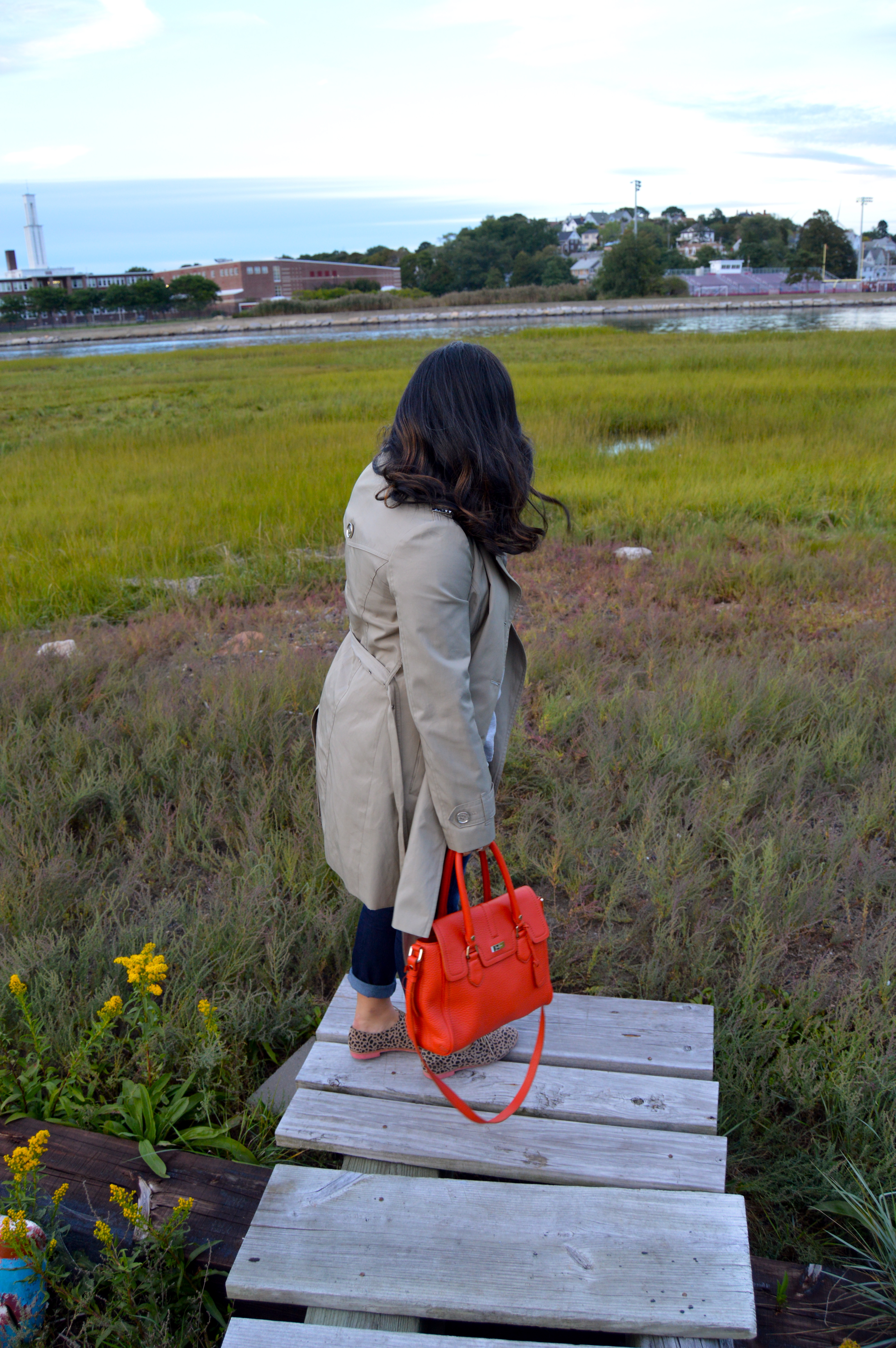 The first two pieces I dug out from storage were my trench coat and oxfords. They are perfect for a cool day – paired here with jeans, a basic sweater, and a bright bag (for a little punch!). Both pieces are an absolute staple in my Fall wardrobe, practically my uniform!